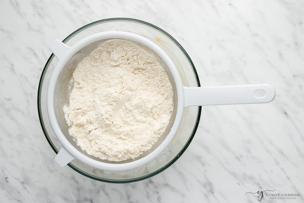 - In a separate bowl, whisk together the flour, baking powder, and xanthan gum. Sieve the flour mixture into the wet ingredients.