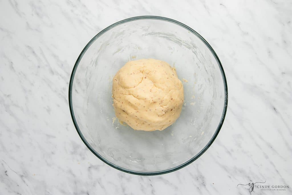 - Now, beat until the mixture starts to come together, then work it into a dough with your hands. The dough should be slightly sticky, soft, and workable. If it’s too dry and crumbly, add a little almond milk. If it’s too wet, add a little more gluten-free flour. Roll the dough into a ball and let it chill in the fridge.