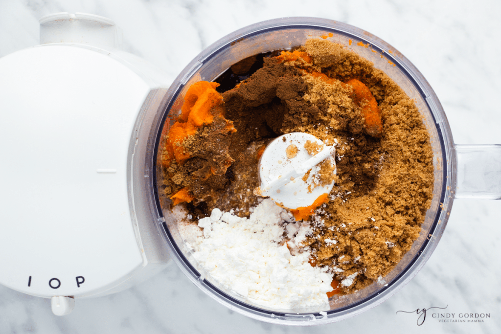 - Then, add the sweet potato puree, brown sugar, cornstarch, cinnamon, nutmeg, ginger, vanilla extract, salt, flax egg, canola oil, and coconut milk to the food processor.