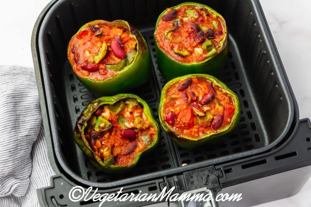 - Placed stuffed peppers into air fryer basket. Cook at 360 degrees F for 12 minutes. Remove from air fryer but keep in basket.