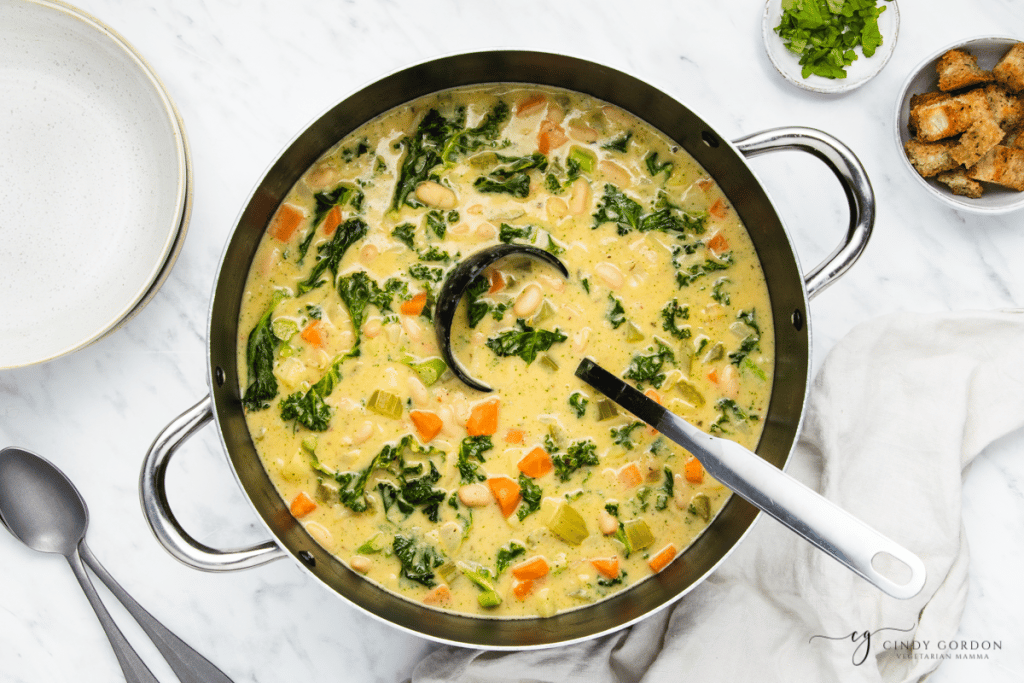 You are going to love this rich and creamy White Bean and Kale Soup! This delicious soup is vegan and dairy free, packed with protein and veggies, and the perfect comfort food meal for a cold day.